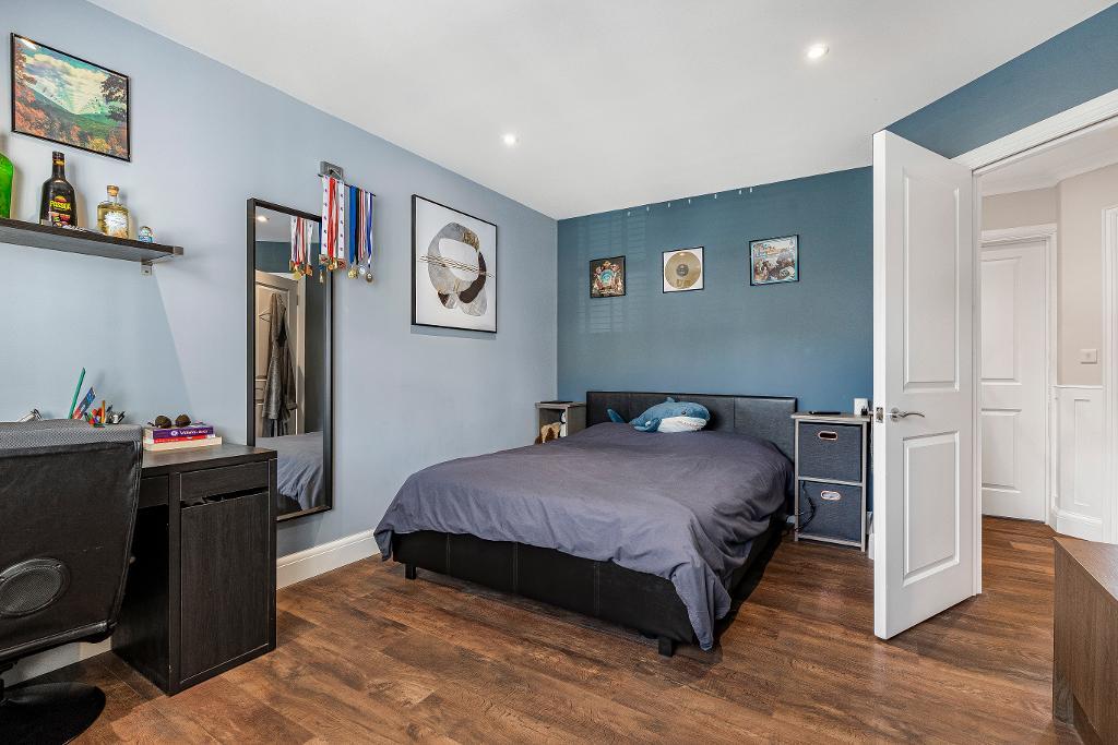 Substantial double bedroom with wood effect vinyl flooring, recessed overhead lighting, plenty of eave storage to sides, two radiators, two aluminium double glazed windows, floor to ceiling triangle aluminium double glazed picture window and door with Juliette balcony providing stunning views of the surrounding countryside and gorgeous sunsets, walk-in wardrobe with fitted hanging rails, eave storage to front. Leading to: