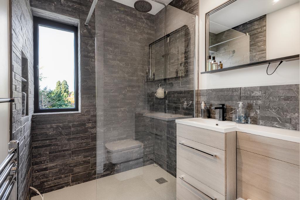 Underfloor heated natural stone floor with low level wall hung wc, integrated wash hand basin vanity unit and tiled surround.