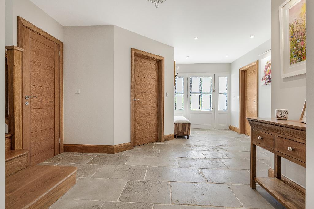 Covered entrance porch with overhead light to part glazed bespoke front door leading to spacious entrance hallway with natural stone floors, underfloor heating, spotlights, picture lights and oak doors leading to: