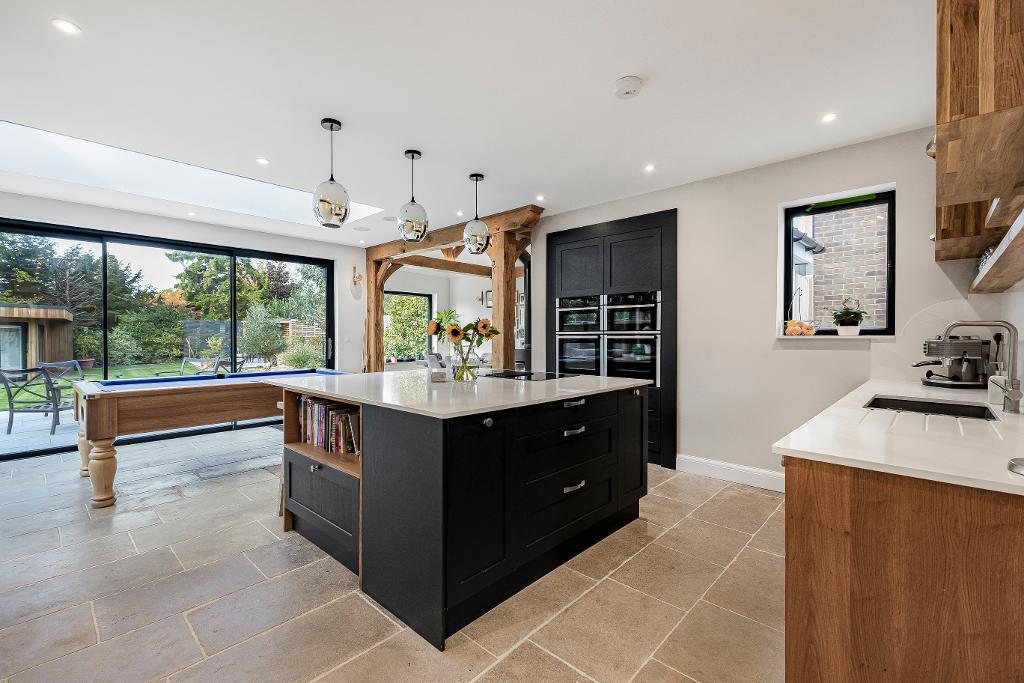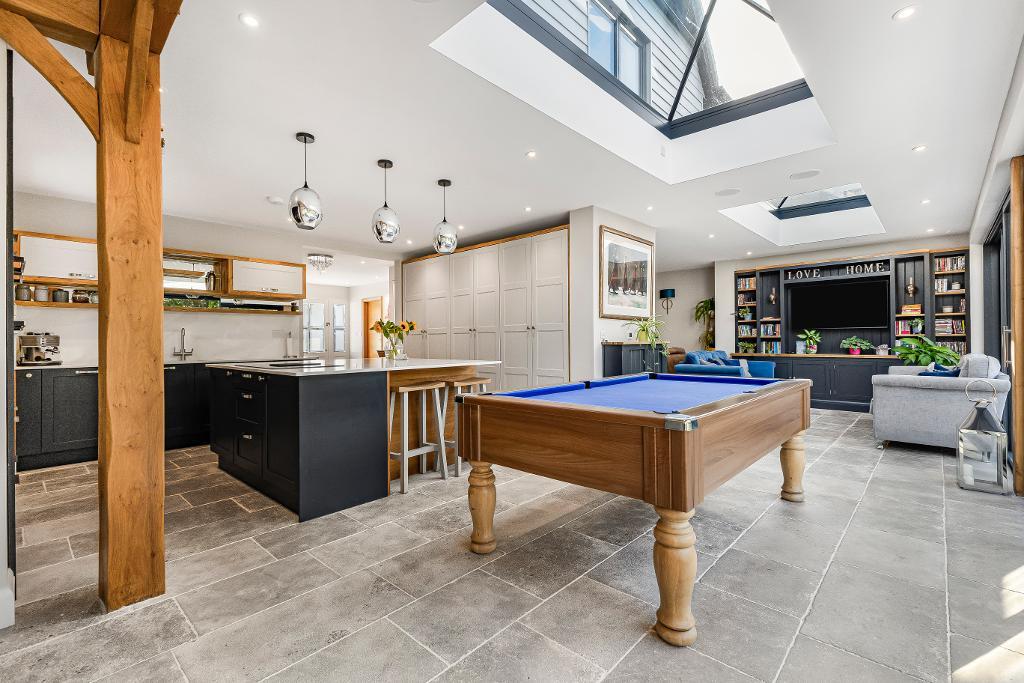THE FAMILY AREA: is situated under the roof lanterns and incorporates space for a pool table and seating area, a bespoke dresser / TV unit with under cupboards and shelves above with lighting and a solid oak worktop.