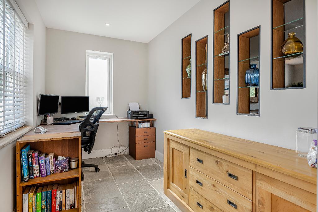 Underfloor heated natural stone flooring with wood effect double glazed sash windows to front and same fixed pane window to side and spotlights in ceiling.