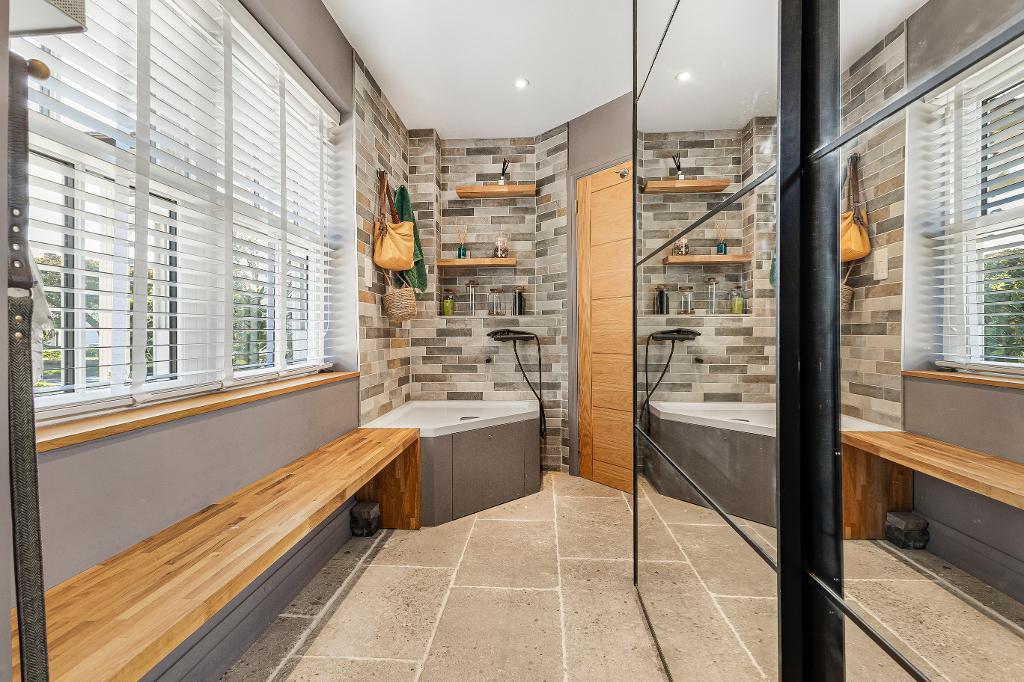 Underfloor heated natural stone flooring, fitted cupboards with mirrored sliding doors, raised shower tray with mains fed hand held shower and tiled surround, solid oak bench seat, double glazed wood effect sash windows, cupboard housing water softener and gas and electric meter, spotlights and composite door creating side access to property.