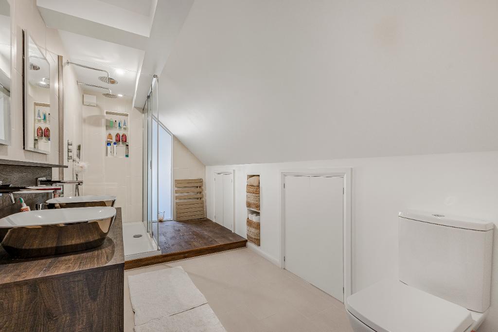 Part wood effect vinyl flooring and part tiled floors and walls, spotlights to ceiling, eaves storage to front, low level white wc, dark wood wall hung double vanity unit with double drawers, two wash basins with wall mounted chrome mixer taps, two built in mirrored cabinets with LED lighting and shaver points, double shower enclosure with white shower tray, two rain shower heads, integrated chrome mixer taps, one handheld shower hose, integrated glass shelving and glass enclosure with sliding door.