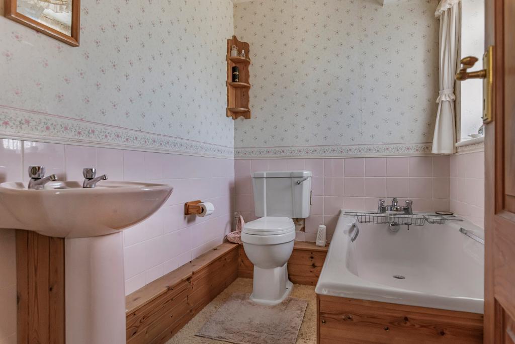 opaque leaded light window to rear: suite comprising panel enclosed bath: low level w.c.: pedestal wash hand basin: part tiled walls: radiator.