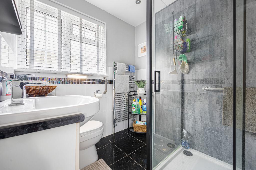 with opaque double glazed window to front aspect: fitted with a modern suite comprising a large enclosed shower cubicle with 'Mira' power shower fitting: low level w.c.: vanity wash hand basin with storage under: heated towel radiator: part tiled walls: tiled flooring.