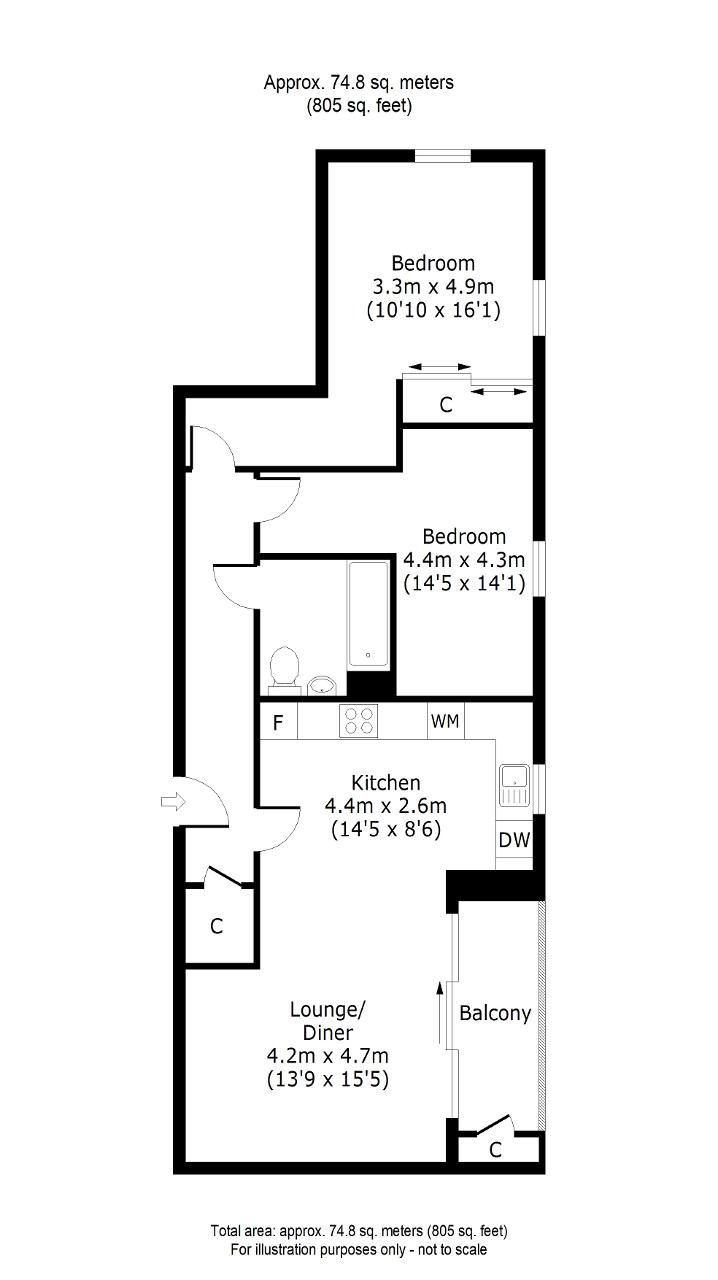 Wood flooring throughout, sliding double glazed doors to balcony; dining area and modern fitted kitchen with window to front. Integrated dishwasher / fridge-freezer / washer-dryer, electric oven, electric hob, extractor fan, sink with mixer tap and tiled surround.
