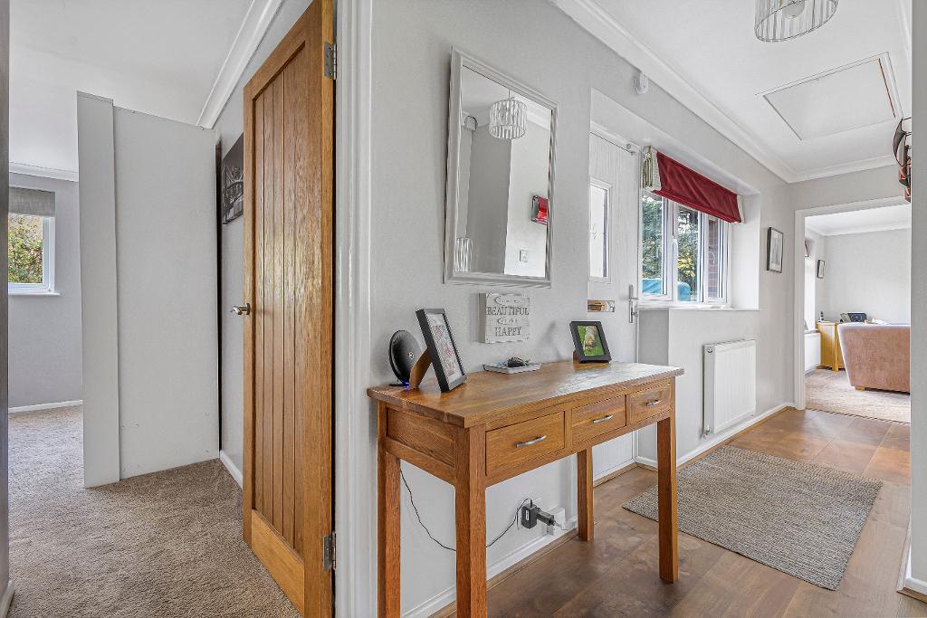 Composite front door leading to wood effect vinyl flooring, wall hung radiator, double glazed window to front, coved ceiling and loft access with pull down ladder:doors to:-