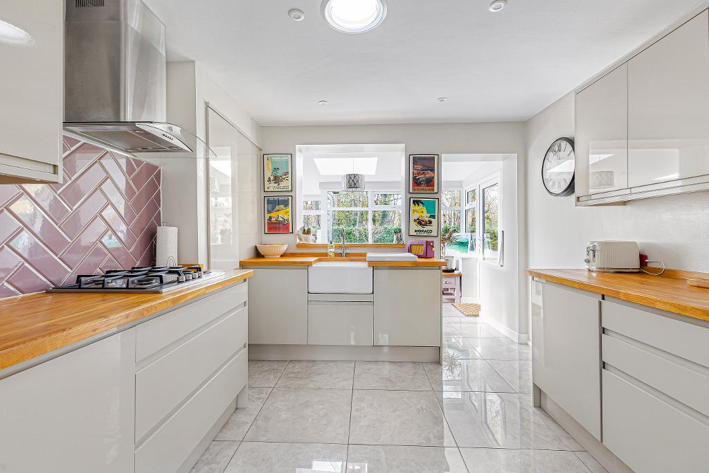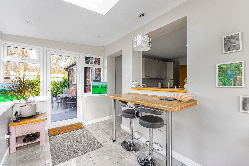 Within P-shaped extension with porcelain tiled floor with underfloor heating, double glazed windows and door to side and double glazed French doors and windows overlooking the superb rear garden, two fixed double glazed roof lanterns, solid oak breakfast bar leading to:-