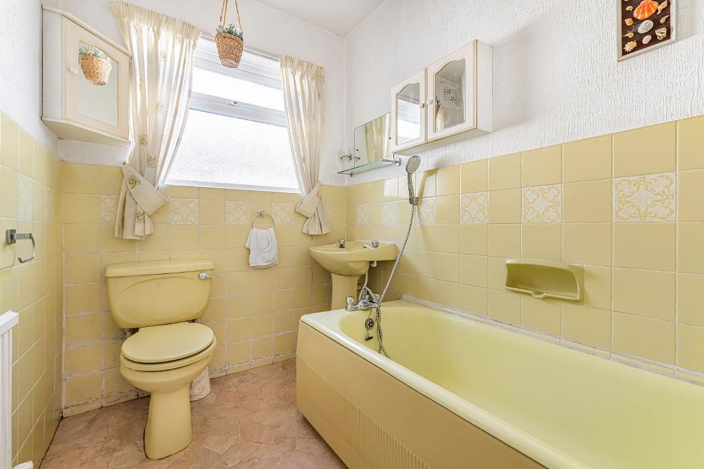 opaque double glazed window to side aspect: suite comprising panel enclosed bath with hand/shower attachment: pedestal wash hand basin: low level w.c.: part tiled walls: vinyl tile effect flooring: radiator.
