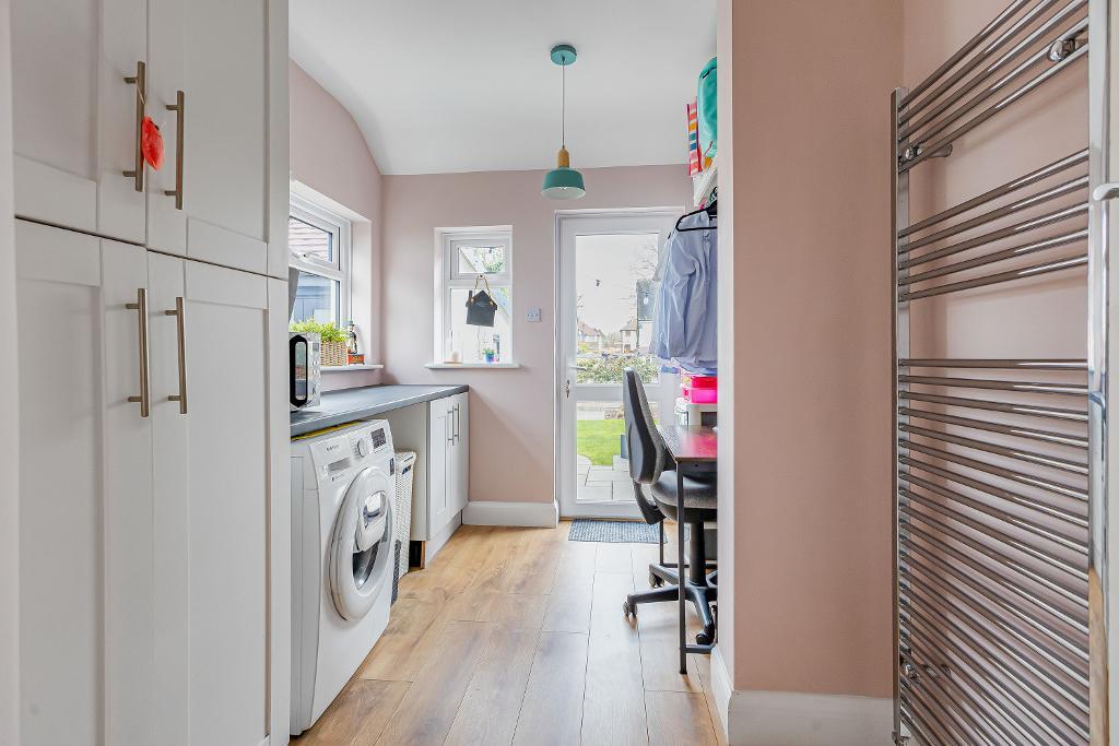 Double glazed window to side: door to rear garden: fitted full height storage cupboard: low level fitted unit with work surfaces over: space and plumbing for washing machine: boiler: laminate wood flooring: heated ladder radiator: