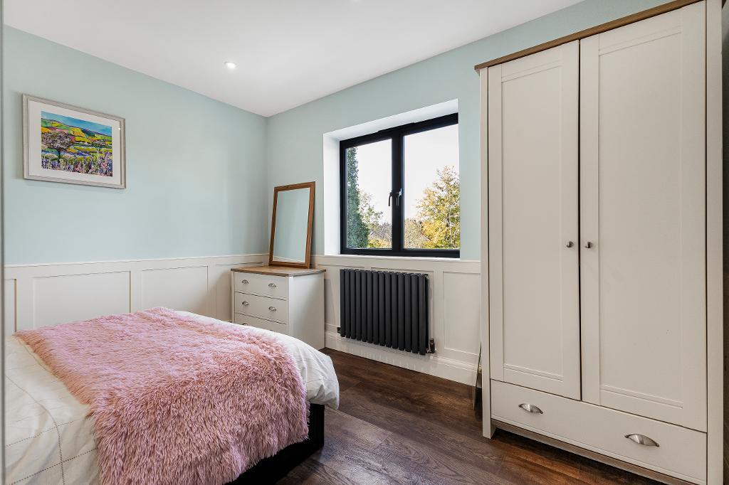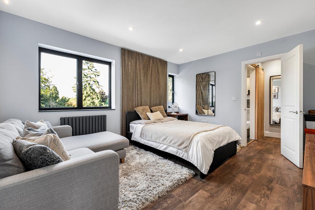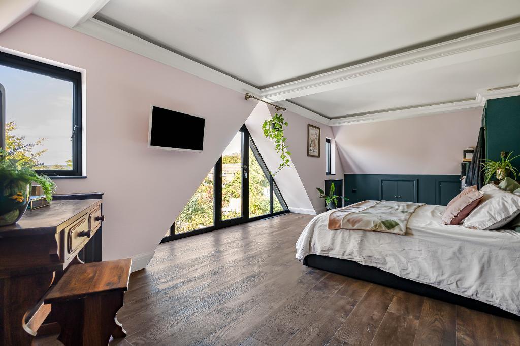 Substantial double bedroom with wood effect vinyl flooring, recessed overhead lighting, plenty of eave storage to sides, two radiators, two aluminium double glazed windows, floor to ceiling triangle aluminium double glazed picture window and door with Juliette balcony providing stunning views of the surrounding countryside and gorgeous sunsets, walk-in wardrobe with fitted hanging rails, eave storage to front. Leading to: