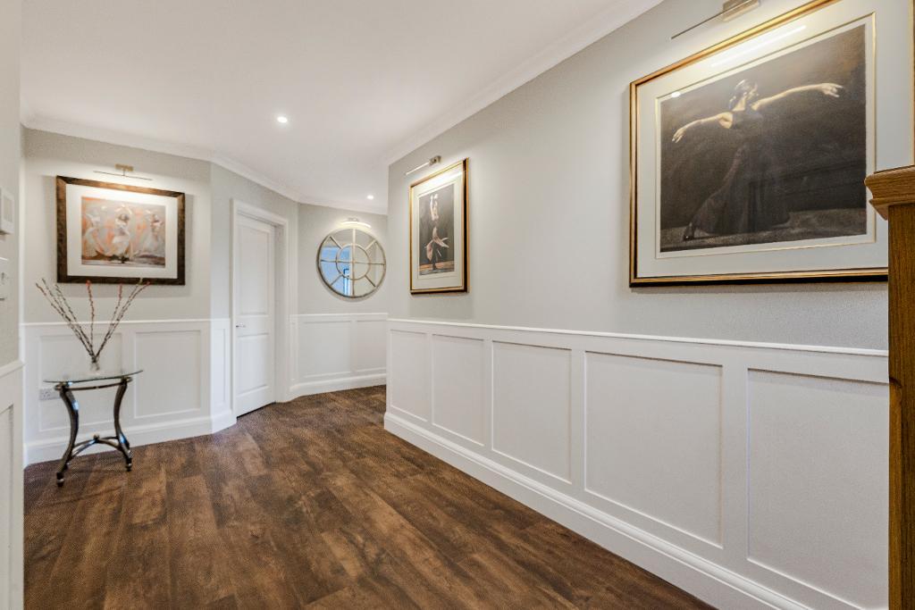 Solid oak stair case and balustrade, large double glazed picture window with oak sill with side view leading up to wood effect vinyl flooring with half panelled walls, picture lights and spotlights to ceiling with doors leading to:
