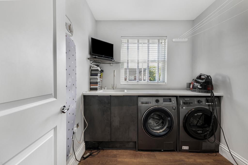 Wood effect vinyl flooring, double glazed wood effect sash window with front view, wood effect venetian blind, spotlights, granite work top with undermounted resin sink and mixer tap, wood effect base unit, ironing board holder, retractable clothes line and space for washing machine and tumble dryer