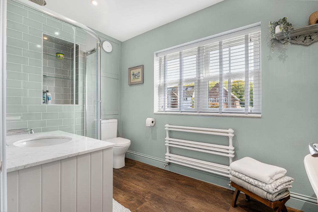 wood effect vinyl flooring, double glazed wood effect sash windows with front view, wood effect venetian blinds, spotlights, white radiator, white bathroom suite comprising of low level wc, fully tiled 900mm quadrant shower enclosure with glass sliding door, rain shower head and integrated mixer taps with separate hand held shower hose, sink vanity unit with two drawers, marble top and undermounted white ceramic sink and mixer tap, modern roll top bath with push button water function with part panelled surround and inset tiled shelf.