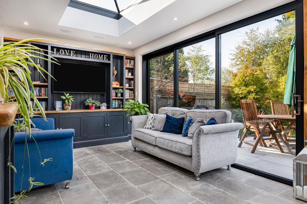 A step down from the hallway, the open plan kitchen, dining room and family room has dimmable spotlights in ceiling and underfloor heated, natural stone flooring throughout, two remote controlled opening double glazed aluminium roof lanterns, and floor to ceiling double glazed, argon gas filled aluminium sliding doors and windows to the rear providing a picturesque view of the garden.