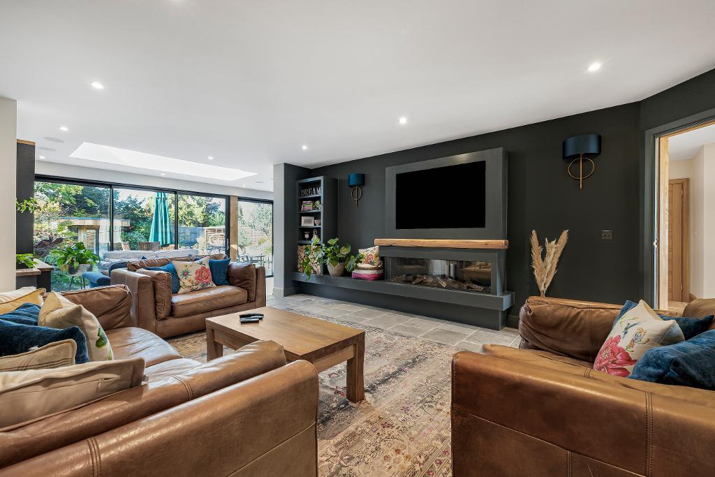 Underfloor heated natural stone floor, dimmable wall lights and spot lights to ceiling, bespoke media unit with integrated electric real flame effect fire with solid oak mantel, space for integrated TV and surround sound speakers, shelving unit and decorative oak and glass shelving feature to front wall.