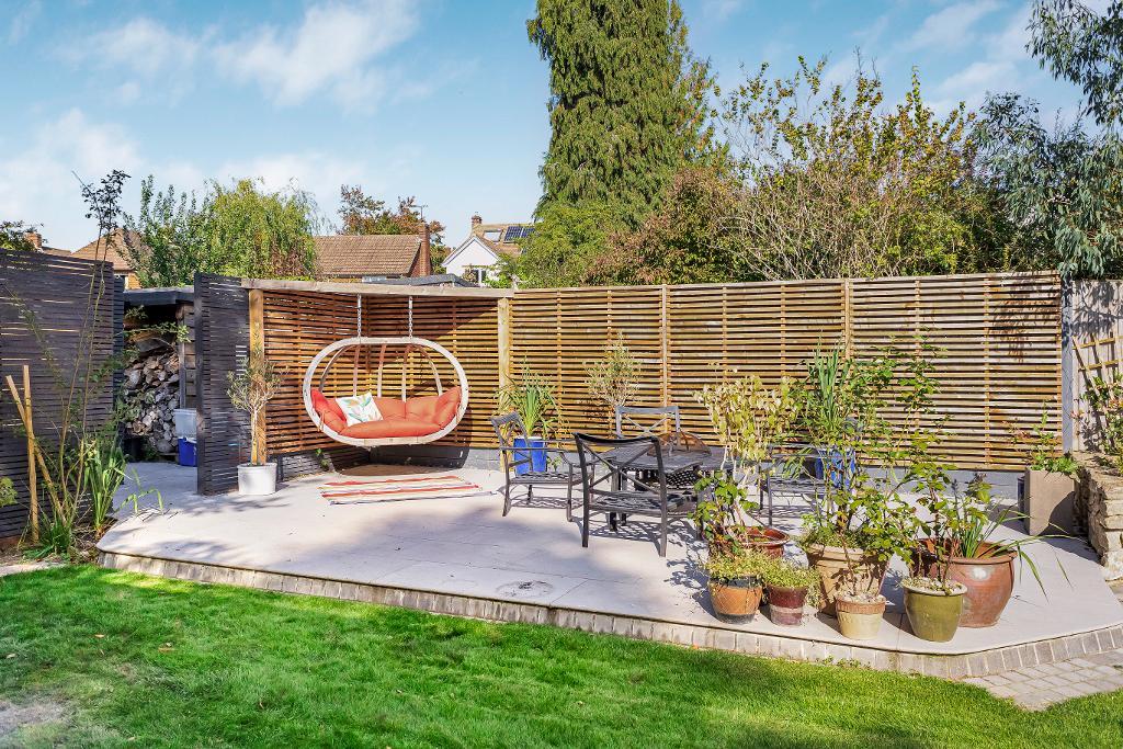 The attractive rear garden is well maintained and a real feature of this property. With gated side access from the front and exterior lighting throughout, large area of lawn, two paved patio areas one with a garden swing chair, two well stocked raised flower beds made from natural Purbeck stone, and a hidden storage area to the rear accommodating a log store, garden shed, bike store and space for storage boxes for cushions and BBQ equipment etc