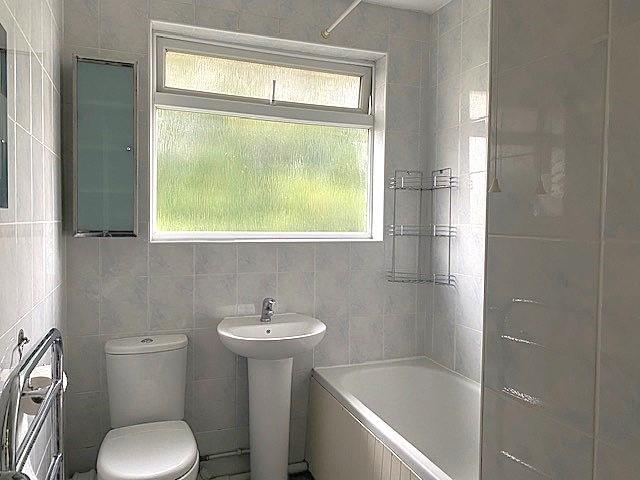 Double glazed window to rear: suite comprising panel enclosed bath, electric shower over: pedestal wash hand basin: low level w.c.: tiled walls: heated towel rail.