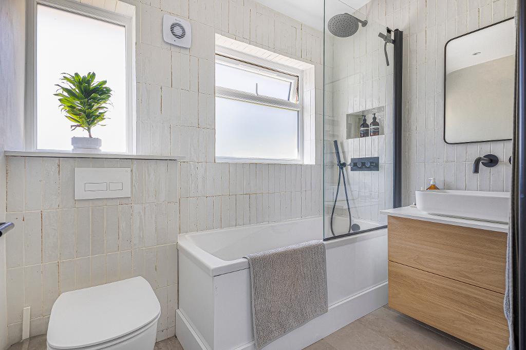with 2 opaque double glazed windows to rear aspect: fitted with a contemporary style suite comprising panel enclosed bath with thermostatic shower fitting over, glass screen: large vanity wash hand basin with storage unit under: low level w.c.: heated towel radiator: extractor fan: part tiled walls: tiled floor.
