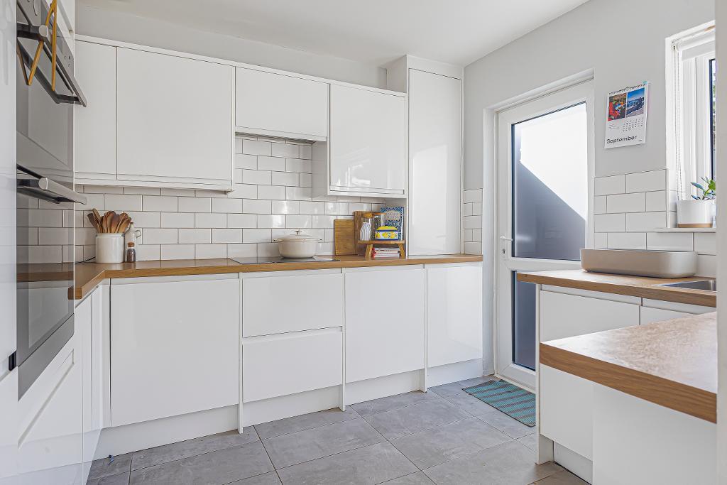 with double glazed door & window to garden: fitted with a range of contemporary style wall and base storage units with work surfaces over: stainless steel sink unit with mixer tap: space & plumbing for washing machine: integrated dishwasher: integrated 'AEG' double oven: integrated 'AEG' induction hob with extractor over: integrated 'Electrolux' fridge/freezer: matching cupboard housing wall mounted 'Vaillant' boiler: part tiled walls: tiled flooring.