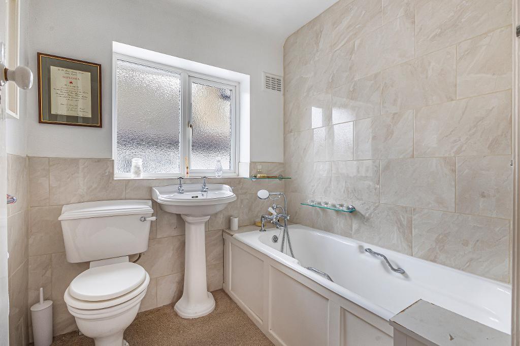 opaque double glazed window to side: suite comprising panel enclosed bath with hand shower attachment: low level w.c.: pedestal wash hand basin: radiator: part tiled walls.