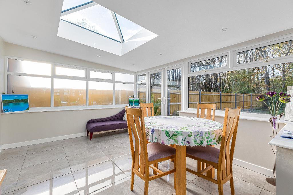Within P-shaped extension with porcelain tiled floor with underfloor heating, double glazed windows and door to side and double glazed French doors and windows overlooking the superb rear garden, two fixed double glazed roof lanterns, solid oak breakfast bar leading to:-