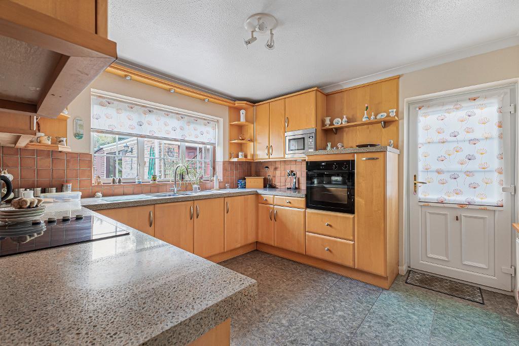 double glazed window overlooking rear garden: double glazed door to side: fitted with range of wall and base storage cupboards with work surfaces over: 1.5 bowl single drainer stainless steel sink unit with mixer tap: integrated 'Neff' hob with extractor over: integrated 'Neff' oven: integrated 'Bosch' under counter fridge: integrated 'Neff' under counter freezer: radiator: coved ceiling: tile effect flooring: part tiled walls: door to:-