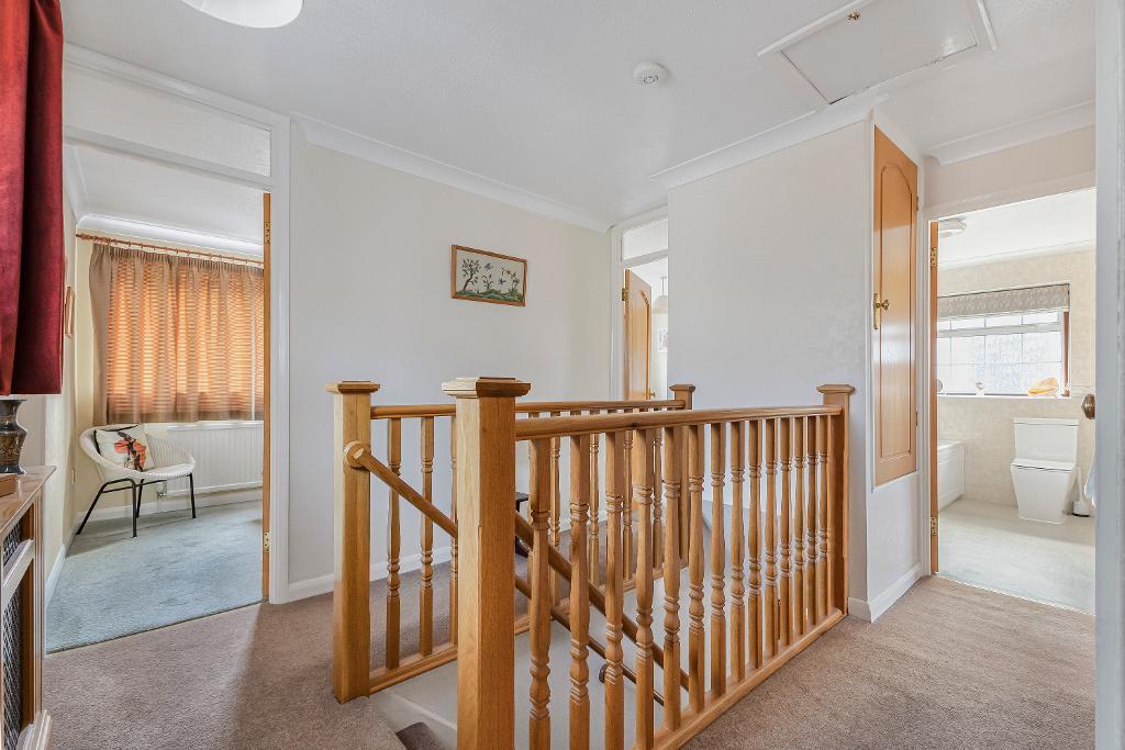 opaque double glazed window to side aspect: access to part boarded loft via pull down ladder: over stairs storage cupboard: further airing/storage cupboard also housing 'Worcestor' boiler: radiator: doors to:-