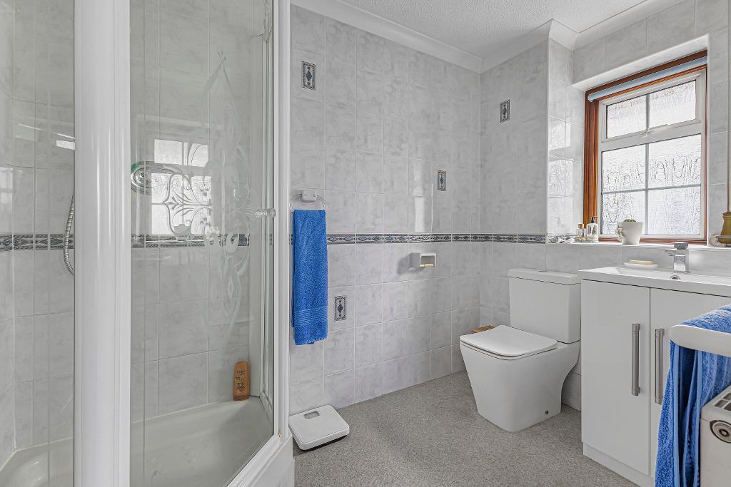 opaque double glazed window to side: suite comprising large shower cubicle with thermostatic fitting: low level w.c.: vanity wash hand basin with storage under: radiator: tiled walls: vinyl flooring: coved ceiling.
