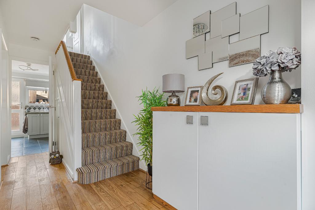 double glazed window to front: built-in cupboard also housing meters: stairs to first floor: under stairs storage cupboard: wood flooring: doors to:-