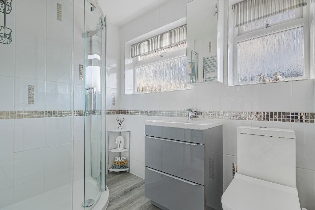 2 opaque double glazed windows to rear aspect: fitted with contemporary style suite comprising large shower cubicle with 'Aqualisa' power shower, sliding door: vanity wash hand basin with storage under: low level w.c.: towel radiator: tiled walls: laminate flooring.